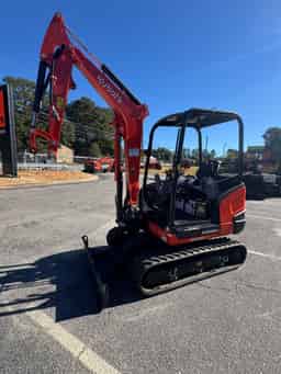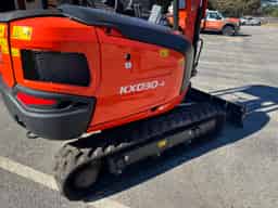 The Kubota KX030-4R1 is a compact excavator with a 24.7 horsepower engine, an operating weight of approximately 6,272 lbs, and a maximum bucket breakout force of 6,924 lbs. Key specifications include a maximum digging depth of 9 ft 7 in, an overall width of 4 ft 11 in, and a traveling speed of up to 2.7 mph. It features a comfortable operator station with a large cab, auxiliary hydraulics, and an auto-downshift function for improved travel performance.